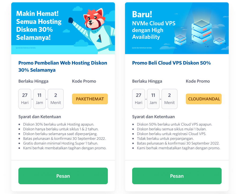 Setiap bulan tiap hosting pasti punya promo diskonnya masing-masing. Sebagai contoh ini promo diskon hosting September 2022 :